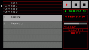 Neben diesen Farben symbolisieren die Icons STOPP, PAUSE und PLAY links daneben den vom Benutzer ausgewählten Abspielzustand. Links neben der Zeitangabe befindet sich ein Uhren-Symbol, welches den Status eines eventuell empfangenen Timecodes darstellt. Das Symbol mit einem Fragezeichen in der Mitte zeigt an, dass die Show nicht auf den Timecode synchronisiert ist, wenn die Uhr vollständig dargestellt wird, ist die Show synchron zum empfangenen Timecode.