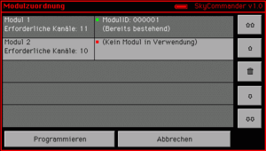 Bitte beachten Sie, das manuell vorgenommene Einträge in der Modulprogrammierung gelöscht werden können, wenn zu diesem Zeitpunkt eine automatische Show geladen ist. Wenn die Modulprogrammierung von Hand durchgeführt wird, sollte daher grundsätzlich KEINE Showdatei geladen sein.